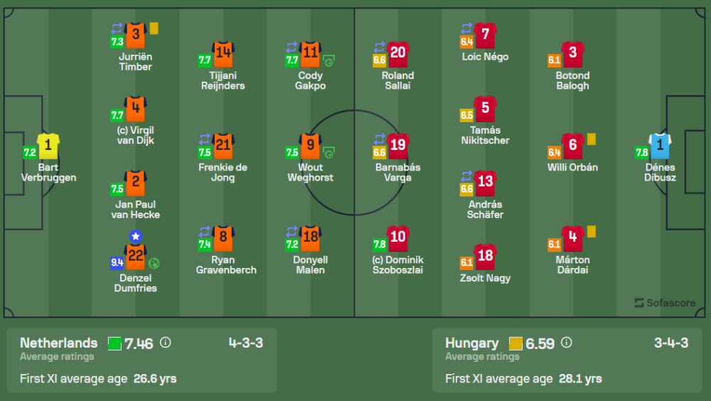 เนเธอร์แลนด์เลือกใช้แผน 4-3-3 โดยเน้นการครองบอลและสร้างโอกาสผ่านการจ่ายบอลที่แม่นยำของเฟรนกี้ เดอ ยอง เกมรุกผ่านริมเส้นโดยมีดุมฟรีส์และมาเลนที่ทำผลงานได้ดี ส่วนฮังการีใช้แผน 3-4-3 แต่ไม่สามารถรับมือกับการบุกที่หลากหลายของทีมเจ้าบ้านได้ ทำให้ถูกโจมตีจากการขึ้นเกมทางปีกขวาของดุมฟรีส์อย่างต่อเนื่อง