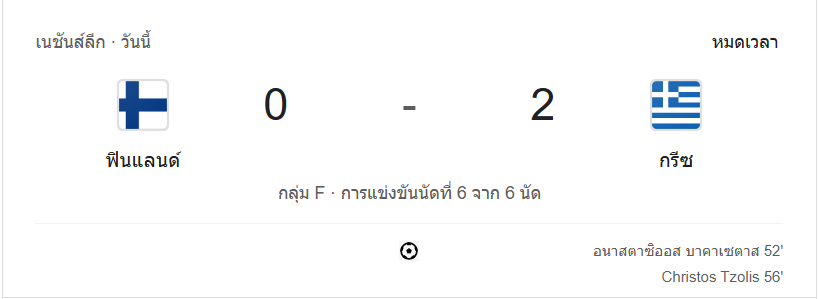 - นาทีที่ 90+6: เกมจบลงด้วยชัยชนะของกรีซ 2-0 จากประตูสำคัญในช่วงต้นครึ่งหลัง