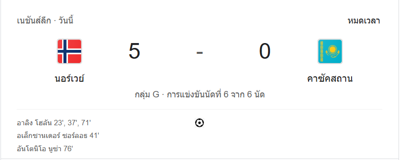 จบการแข่งขัน: นอร์เวย์ชนะคาซัคสถาน 5-0 ด้วยฟอร์มการเล่นอันดุดันของอีร์ลิง ฮาแลนด์และเพื่อนร่วมทีม เกมนี้แสดงให้เห็นถึงความแข็งแกร่งของแนวรุกและการป้องกันที่ยอดเยี่ยมจากเจ้าบ้าน