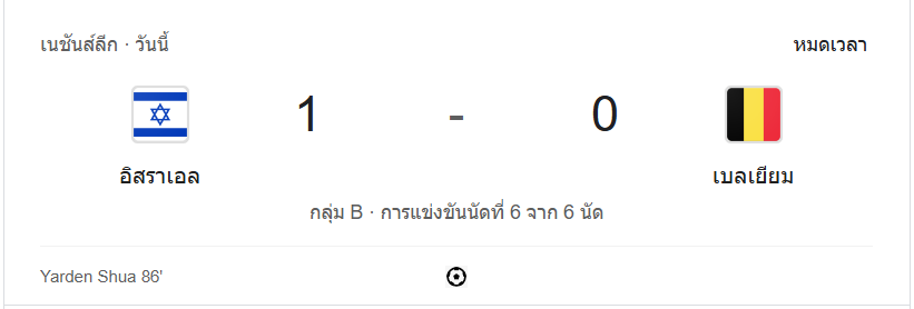 - หมดเวลาการแข่งขัน: อิสราเอลเอาชนะเบลเยียมไป 1-0 ด้วยประตูชัยในนาทีที่ 85 ของ Yarden Shua