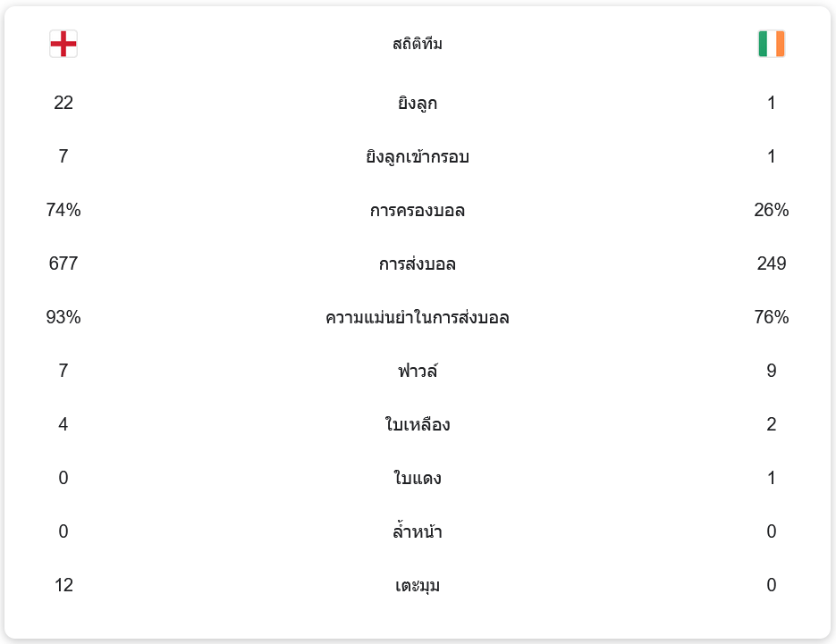 อังกฤษทำผลงานได้อย่างโดดเด่นโดยมีการครองบอลถึง 74% และยิงเข้ากรอบได้ถึง 7 ครั้ง ขณะที่ไอร์แลนด์มีโอกาสยิงเพียง 1 ครั้งเท่านั้น การส่งบอลของอังกฤษแม่นยำถึง 93% ส่วนไอร์แลนด์ทำได้เพียง 76% ชี้ให้เห็นถึงความแตกต่างของทั้งสองทีม