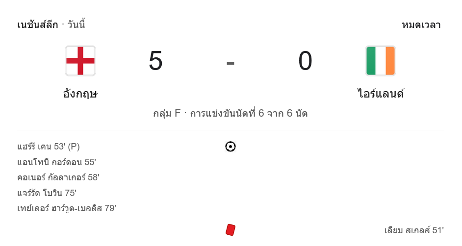 - ⚽ นาทีที่ 55: แอนโทนี กอร์ดอน ยิงประตูเพิ่มให้อังกฤษนำ 2-0