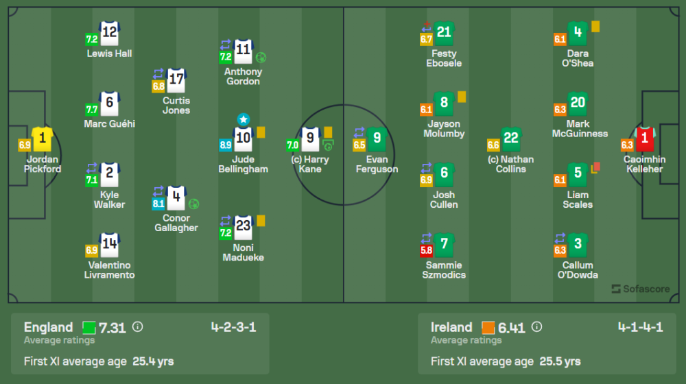 อังกฤษมาในระบบ 4-2-3-1 เน้นเกมรุกจากแนวรุกที่ดุดันโดยมี จู๊ด เบลลิงแฮม คอยคุมเกมในแดนกลางและสนับสนุนการทำเกมให้กับแฮร์รี เคน ส่วนไอร์แลนด์ใช้ระบบ 4-1-4-1 เน้นตั้งรับและโต้กลับ แต่ไม่สามารถต้านทานการบุกของอังกฤษได้ ความแตกต่างคือการครองบอลที่อังกฤษเหนือกว่าถึง 74% พร้อมการยิงเข้ากรอบที่แม่นยำกว่า