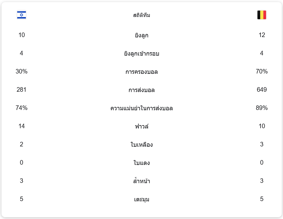 เกมนี้เบลเยียมครองบอลได้ถึง 70% แต่ยิงเข้ากรอบเพียง 4 ครั้งจากทั้งหมด 12 ครั้ง ขณะที่อิสราเอลมีโอกาสยิง 10 ครั้ง เข้ากรอบ 4 ครั้ง โดยความแม่นยำในการส่งบอลของเบลเยียมสูงถึง 89% ส่วนอิสราเอลมีเพียง 74% ซึ่งชี้ให้เห็นถึงความพยายามในการเล่นเกมรับของทีม