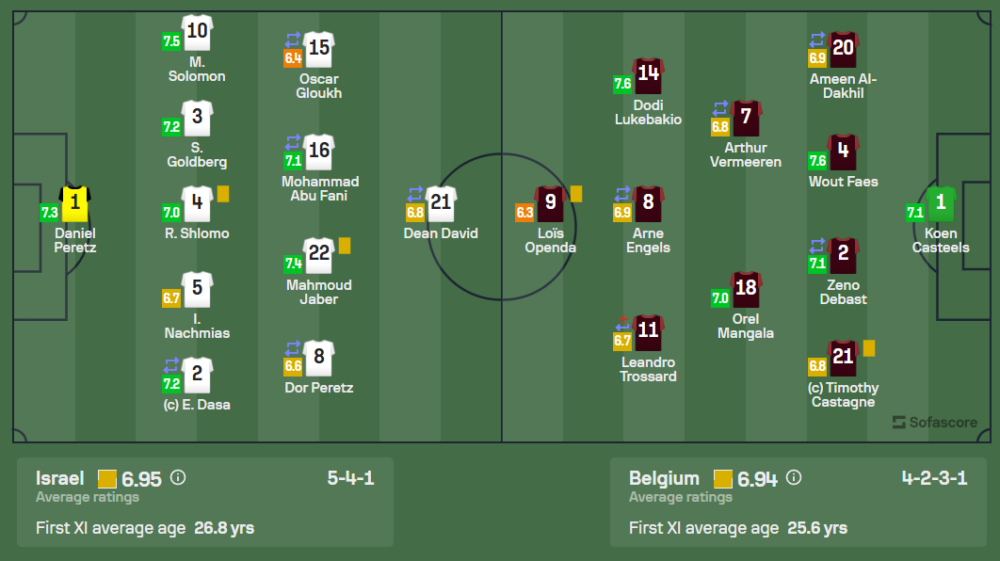 อิสราเอลเลือกใช้ระบบ 5-4-1 เน้นตั้งรับแน่นหนาและโต้กลับเร็ว ขณะที่เบลเยียมมาในแผน 4-2-3-1 พยายามครองเกมด้วยการต่อบอลสั้น แต่เจาะผ่านแนวรับของอิสราเอลได้ยาก ความแตกต่างคืออิสราเอลมีการโต้กลับที่มีประสิทธิภาพและเล่นเป็นทีม ขณะที่เบลเยียมพึ่งพาความสามารถส่วนตัวของนักเตะ แต่ไม่สามารถเปลี่ยนโอกาสเป็นประตูได้