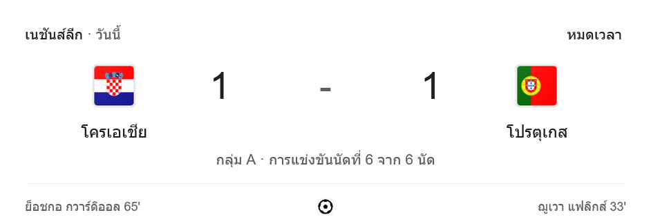 การแข่งขัน ยูฟ่าเนชันส์ลีก 2024 นัดสุดท้ายของกลุ่ม A ระหว่าง โครเอเชีย และ โปรตุเกส จบลงด้วยผลเสมอ 1-1 อย่างดุเดือด ทั้งสองทีมงัดฟอร์มเด็ดออกมาโชว์เต็มที่ในเกมที่เต็มไปด้วยจังหวะสำคัญและการต่อสู้ในแดนกลาง ผลนี้ทำให้โปรตุเกสจบอันดับหนึ่งของกลุ่ม ส่วนโครเอเชียตามมาที่อันดับสอง แฟนบอลที่ติดตาม ผลบอลสด ต่างพากันพูดถึงเกมนี้อย่างต่อเนื่อง