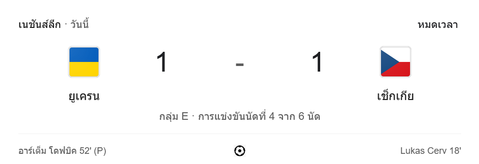 ผลบอลยูฟ่าเนชันส์ลีก 2024 ระหว่าง ยูเครน 1-1 สาธารณรัฐเช็ก วันนี้ 15/10/67