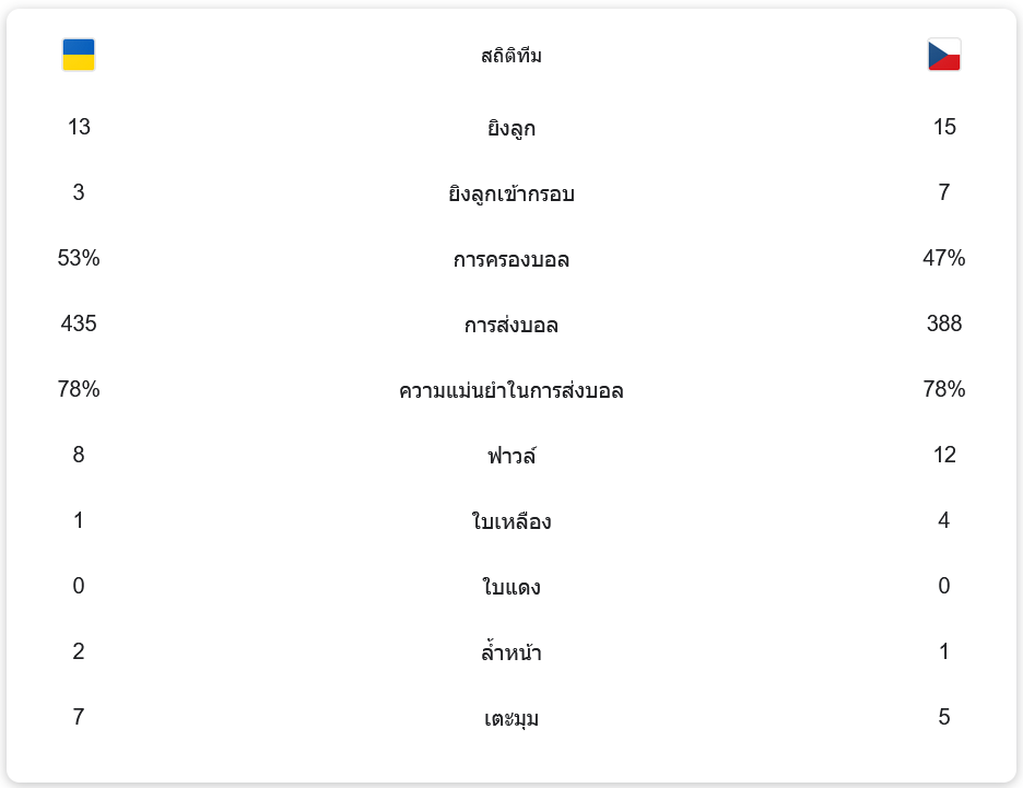 เกมนี้ยูเครนเป็นฝ่ายครองบอลได้มากกว่าเล็กน้อยที่ 53% ขณะที่เช็กมีการครองบอลอยู่ที่ 47% ยูเครนมีโอกาสยิงทั้งหมด 13 ครั้ง โดยเข้ากรอบเพียง 3 ครั้ง ส่วนเช็กมีโอกาสยิง 15 ครั้ง และเข้ากรอบ 7 ครั้ง แต่ทั้งสองทีมมีความแม่นยำในการส่งบอลที่เท่ากันที่ 78% ยูเครนโดนใบเหลืองไป 1 ใบ ส่วนเช็กนั้นโดนไปถึง 4 ใบ ซึ่งแสดงถึงความเข้มข้นของเกมในวันนี้