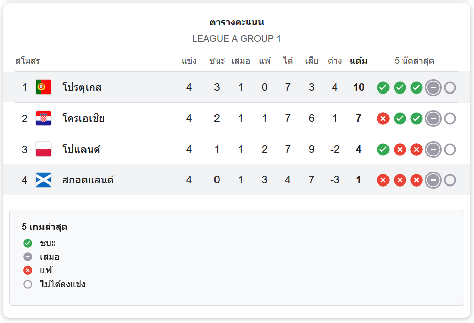 โปรตุเกสยังคงครองอันดับหนึ่งในกลุ่ม A ด้วยคะแนนรวม 10 คะแนน จากการแข่ง 4 นัด ขณะที่สกอตแลนด์ยังอยู่ท้ายตารางด้วย 1 คะแนนจาก 4 นัด การแข่งขันในกลุ่มนี้ยังคงเข้มข้นและมีโอกาสเปลี่ยนแปลงในนัดถัดไป