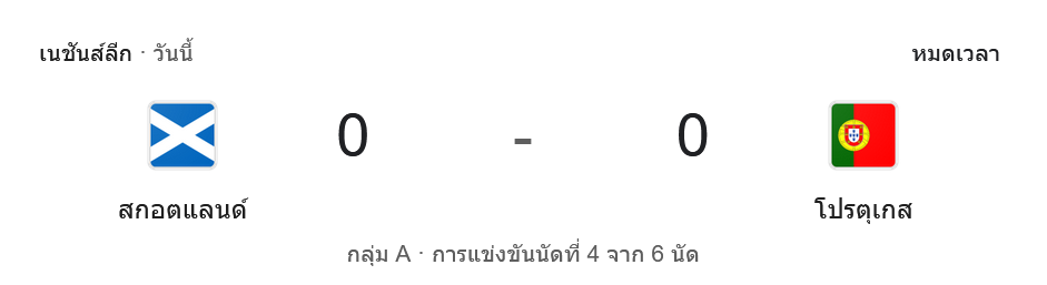 การแข่งขัน ยูฟ่าเนชันส์ลีก 2024 กลุ่ม A นัดที่ 4 ระหว่าง สกอตแลนด์ และ โปรตุเกส สิ้นสุดลงด้วยผลเสมอ 0-0 เกมนี้แม้ว่าโปรตุเกสจะครองบอลได้มากถึง 70% และสร้างโอกาสยิงได้มากกว่า แต่ก็ไม่สามารถเจาะแนวรับของสกอตแลนด์ได้ โดยทีมสกอตแลนด์แสดงให้เห็นถึงความแข็งแกร่งในเกมรับและความกล้าหาญในการตั้งรับเกมบุกของโปรตุเกส ซึ่งมีโอกาสหลายครั้ง แต่ก็ไม่สามารถทำประตูได้