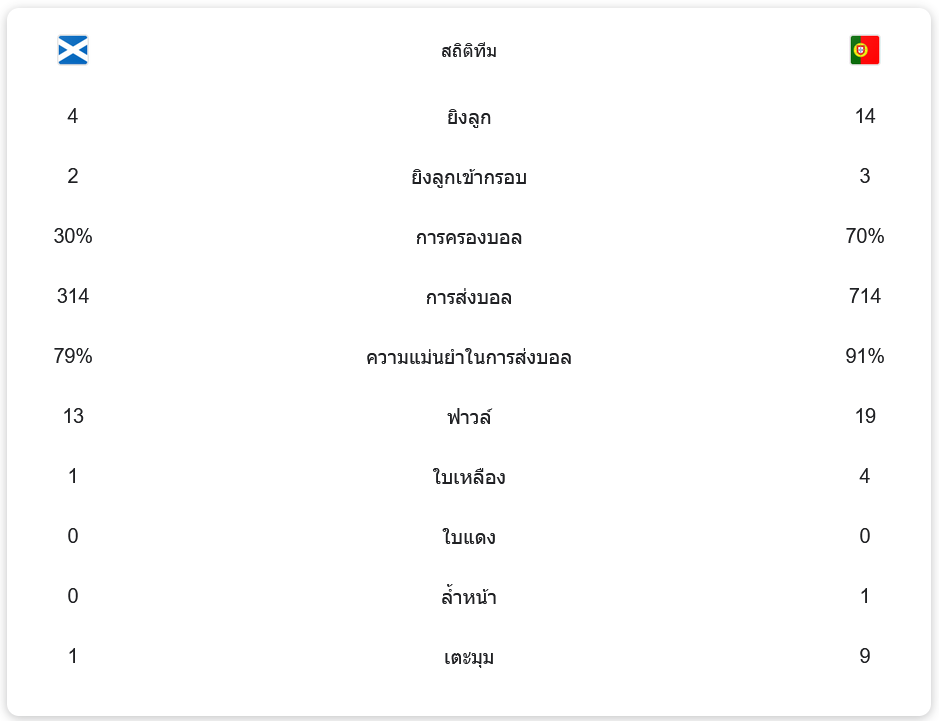 โปรตุเกสครองเกมได้ถึง 70% ของเวลาการแข่งขัน และมีโอกาสยิงทั้งหมด 14 ครั้ง เข้ากรอบ 3 ครั้ง ขณะที่สกอตแลนด์มีโอกาสยิงเพียง 4 ครั้ง และเข้ากรอบ 2 ครั้ง ความแม่นยำในการส่งบอลของโปรตุเกสสูงถึง 91% ด้วยการส่งบอลทั้งหมด 714 ครั้ง ขณะที่สกอตแลนด์ทำได้เพียง 314 ครั้ง การครองเกมของโปรตุเกสชัดเจนแต่ไม่สามารถแปลงเป็นประตูได้