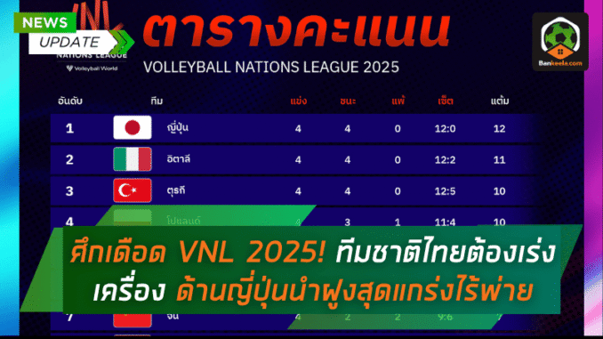 สถานการณ์ ตารางคะแนนวอลเลย์บอลหญิง VNL 2025 ล่าสุด ณ วันที่ 8 มิถุนายน ยังคงเข้มข้นขึ้นทุกขณะ โดยเฉพาะในกลุ่มหัวตารางที่ทีมชาติญี่ปุ่นโชว์ฟอร์มได้อย่างไร้ที่ติ ชนะรวด 4 นัด ไม่เสียแม้แต่เซตเดียว แสดงให้เห็นถึงมาตรฐานระดับโลกของทีมหญิงแดนอาทิตย์อุทัยที่ยังคงรักษาสถานะตัวเต็งลุ้นแชมป์ได้อย่างเหนียวแน่น ขณะเดียวกัน ทีมชาติไทย ต้องรีบปรับจูนฟอร์มโดยด่วน หลังจบสัปดาห์แรกด้วยผลงานชนะ 1 แพ้ 3 รั้งอันดับ 15 ของตาราง มีเพียง 3 คะแนน ต้องลุ้นเหนื่อยในสัปดาห์ถัดไป หากหวังอยู่รอดปลอดภัยในฤดูกาลนี้
