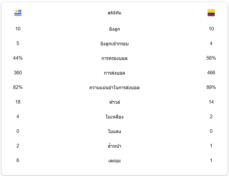 เกมนี้อุรุกวัยมีโอกาสยิง 10 ครั้ง เข้ากรอบ 5 ครั้ง ส่วนโคลอมเบียยิงเท่ากันแต่เข้ากรอบ 4 ครั้ง อุรุกวัยครองบอลเพียง 44% เทียบกับโคลอมเบียที่มีถึง 56% ความแม่นยำในการส่งบอลของโคลอมเบียดีกว่า 89% เทียบกับ 82% ของอุรุกวัย