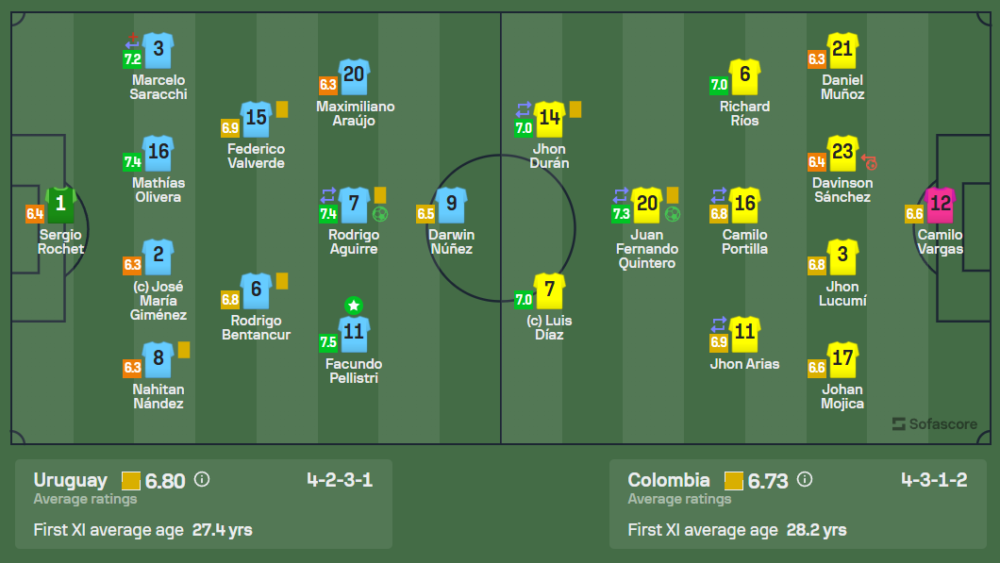 อุรุกวัยใช้แผน 4-2-3-1 เน้นเกมรุกจากปีกและการสร้างจังหวะจากกองกลางคู่ใจ อูการ์เต้และเบนทันกูร์ ขณะที่โคลอมเบียมาในแผน 4-3-1-2 ใช้ความเร็วจากกองหน้าและเกมรับที่แข็งแกร่ง จุดเด่นของโคลอมเบียคือการตัดบอลกลางสนามที่เฉียบคม ขณะที่อุรุกวัยเด่นที่การสร้างโอกาสในกรอบเขตโทษ