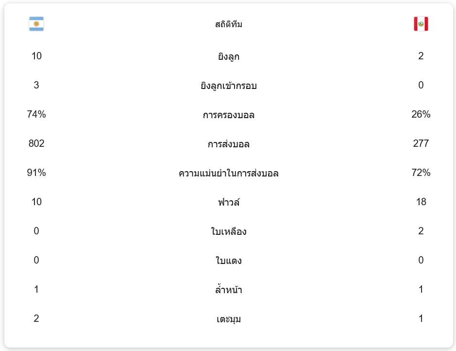 การจ่ายบอล: อาร์เจนตินา 802 ครั้ง (91% แม่นยำ) – เปรู 277 ครั้ง (72% แม่นยำ)
