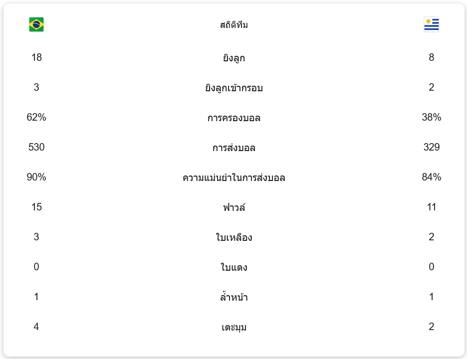 - การส่งบอล: บราซิล 530 ครั้ง (ความแม่นยำ 90%), อุรุกวัย 329 ครั้ง (ความแม่นยำ 84%)