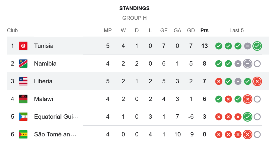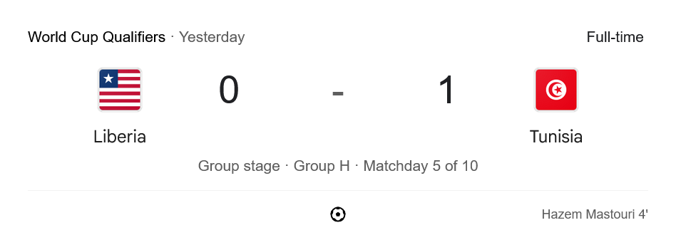 ชัยชนะเกมนี้ทำให้ ตูนิเซียมี 13 แต้มจาก 5 นัด รั้งจ่าฝูงของกลุ่ม H ส่วนไลบีเรียมี 7 แต้ม รั้งอันดับ 3 สถานการณ์ของพวกเขาเริ่มกดดันมากขึ้น