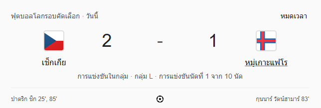 เกมนี้ สาธารณรัฐเช็ก ต้องลุ้นกันจนนาทีสุดท้ายหลังโดน หมู่เกาะแฟโร ตีเสมอช่วงท้ายเกม แต่ก็ยังได้ความยอดเยี่ยมของ ปาทริก ชิค ที่โขกประตูชัยช่วยทีมคว้า 3 แต้มเต็ม แม้จะไม่ใช่เกมที่ง่าย แต่ความเฉียบคมในจังหวะสุดท้ายก็เพียงพอให้พวกเขาประเดิมรอบคัดเลือก ฟุตบอลโลก 2026 ด้วยชัยชนะ ติดตามผลบอลสด และข่าวฟุตบอลโลก 2026 รอบคัดเลือก ได้ที่ บ้านกีฬา อัปเดต บ้านผลบอล รายงาน ผลบอลสด และบทวิเคราะห์แมตช์สำคัญจากทุกลีกทั่วโลกแบบเรียลไทม์!