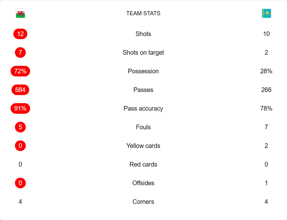 เกมนี้ เวลส์แสดงให้เห็นถึงการควบคุมเกมที่เหนือกว่าชัดเจน โดยมีเปอร์เซ็นต์การครองบอลสูงถึง 72% เทียบกับคาซัคสถานที่มีเพียง 28% เท่านั้น จำนวนการจ่ายบอลของเจ้าบ้านทะลุถึง 684 ครั้ง และมีความแม่นยำสูงถึง 91% ขณะที่ทีมเยือนจ่ายเพียง 266 ครั้ง ความแม่นยำอยู่ที่ 78% เวลส์ยิงทั้งหมด 12 ครั้ง เข้ากรอบ 7 ขณะที่คาซัคสถานยิงได้ 10 ครั้งแต่เข้ากรอบแค่ 2 เวลส์ฟาวล์ 5 ครั้ง ส่วนคาซัคสถานฟาวล์ 7 ครั้ง และมีใบเหลือง 2 ใบ การทำเกมของเวลส์ชัดเจนและมีคุณภาพสูงในแง่ของจังหวะและการคอนโทรลเกม