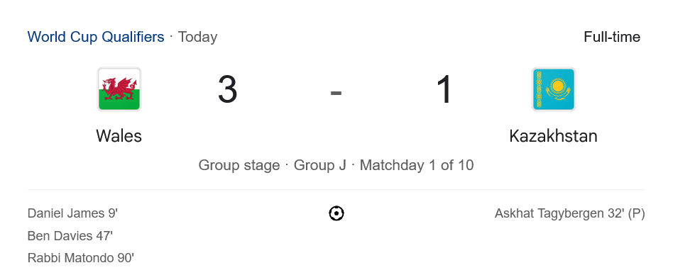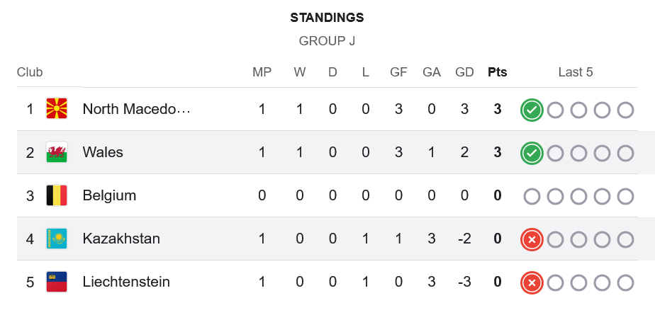 หลังจบนัดแรกของกลุ่ม J เวลส์เก็บ 3 แต้มสำคัญ ขึ้นมารั้งอันดับ 2 รองจากมาซิโดเนียเหนือ ที่ชนะเช่นกันแต่ลูกได้เสียดีกว่า ส่วนคาซัคสถานต้องอยู่ในอันดับ 4 จากการพ่ายนัดแรก โดยเบลเยียมยังไม่ได้ลงสนาม เกมนี้จึงสร้างแรงกระเพื่อมให้กลุ่มนี้ดูเข้มข้นตั้งแต่เปิดหัว