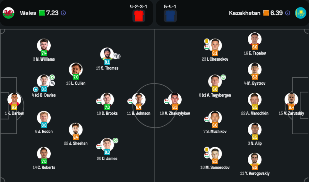 เบน เดวีส์ กัปตันทีมชาติเวลส์ โชว์ฟอร์มโหดทั้งรุกและรับ เติมเกมได้แม่นยำ และยิงประตูสำคัญในช่วงต้นครึ่งหลัง พร้อมจ่าย 1 แอสซิสต์อีกต่างหาก คว้าคะแนนสูงสุด 8.3 จากทุกสายตา ถือเป็นหัวใจของชัยชนะในค่ำคืนนี้อย่างแท้จริง