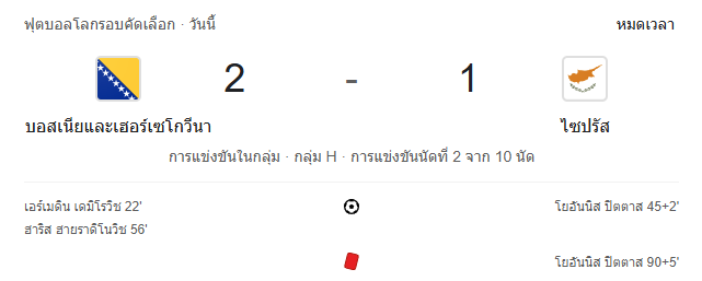 - หมดเวลาการแข่งขัน: บอสเนียและเฮอร์เซโกวีนา 2-1 ไซปรัส
