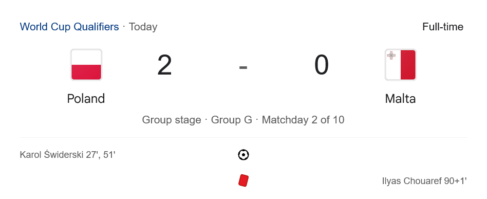 ครึ่งหลังเริ่มมาไม่ถึง 10 นาที กองเชียร์โปแลนด์ก็ได้เฮอีกครั้ง เมื่อ ยาคุบ โมแดร์ แทงทะลุช่องให้ ชวีแดร์สกี้ เจ้าเก่า หลุดเข้าไปยิงผ่านมือผู้รักษาประตูเข้าไปตุงตาข่ายอย่างเยือกเย็น เป็นประตูที่สองของเขาในเกมนี้และพาโปแลนด์นำห่าง 2-0 เกมเริ่มเดือดขึ้นในช่วงท้าย โดยเฉพาะฝั่งมอลตาที่เล่นหนักเกินเหตุ มีใบเหลืองหลายใบตามมา ก่อนจะมาเสียเปรียบหนักในช่วงทดเวลาบาดเจ็บ เมื่อ อิเลียส ชูอาเรฟ ไปเสียบหนักใส่คู่แข่งโดนใบแดงไล่ออกจากสนาม จบเกมโปแลนด์เอาชนะไป 2-0 เก็บ 6 แต้มเต็มจาก 2 นัด ยึดจ่าฝูงกลุ่ม G แบบสุดแกร่ง