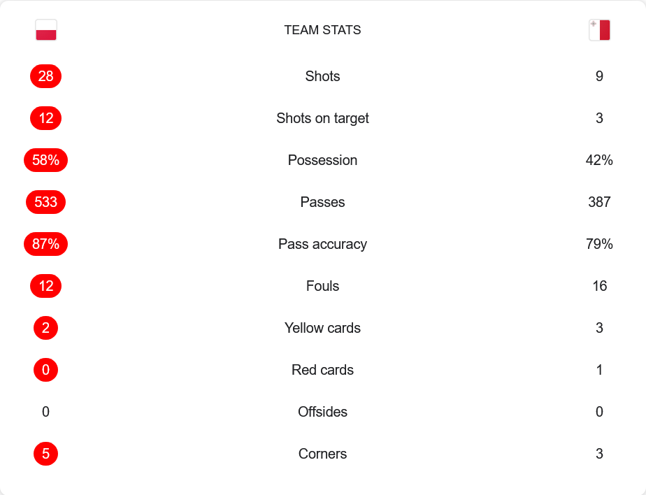 โปแลนด์ครองบอลมากกว่าอย่างชัดเจนที่ 58% และจ่ายบอลมากถึง 533 ครั้ง ด้วยความแม่นยำ 87% พวกเขายิงทั้งหมด 28 ครั้ง เข้ากรอบ 12 ครั้ง สร้างความปั่นป่วนให้แนวรับมอลตาได้ตลอดเกม ขณะที่มอลตามีโอกาสยิงเพียง 9 ครั้ง เข้ากรอบแค่ 3 ครั้ง และจ่ายบอลแม่นยำน้อยกว่าที่ 79% อีกทั้งยังโดนใบแดงในช่วงท้ายเกม และเสียฟรีคิกมากจากการทำฟาวล์ถึง 16 ครั้งเทียบกับ 12 ครั้งของโปแลนด์ โปแลนด์ยังได้เตะมุมมากกว่าที่ 5 ครั้ง ส่วนมอลตาได้เพียง 3 ครั้งเท่านั้น