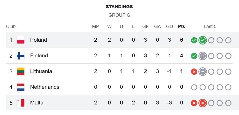 จากชัยชนะในนัดนี้ ทำให้โปแลนด์เก็บเพิ่มเป็น 6 คะแนนเต็มจาก 2 นัด ขึ้นนำจ่าฝูงกลุ่ม G แบบไร้ข้อกังขา โดยมีผลต่างประตูได้เสีย +3 ส่วนฟินแลนด์ตามมาอันดับ 2 มี 4 คะแนน ลิธัวเนีย 1 คะแนน และมอลตายังคงไร้แต้มจาก 2 เกมรั้งบ๊วยของกลุ่มแบบชัดเจน สถานการณ์กำลังเข้าทางโปแลนด์อย่างมากในการคว้าตั๋วรอบถัดไป