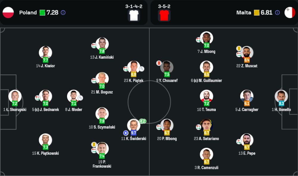 คารอล ชวีแดร์สกี้ คือพระเอกของเกมนี้อย่างแท้จริงด้วยเรตติ้ง 9.7 เขาโชว์ความเฉียบขาดในแดนหน้า ยิงสองประตูสุดคมให้โปแลนด์คว้าชัยอย่างมั่นใจในบ้าน และยังเล่นด้วยความขยัน เคลื่อนที่หาช่องดีเยี่ยม เรียกได้ว่าเกมนี้เขาทำทุกอย่างให้ทีมได้ครบทั้งความเฉียบคมและความอันตราย