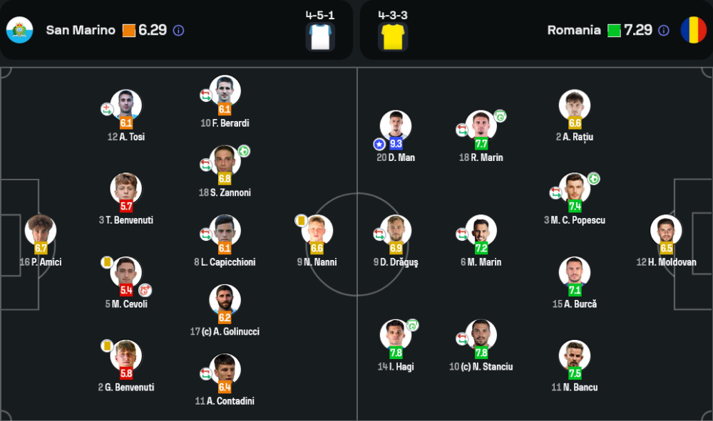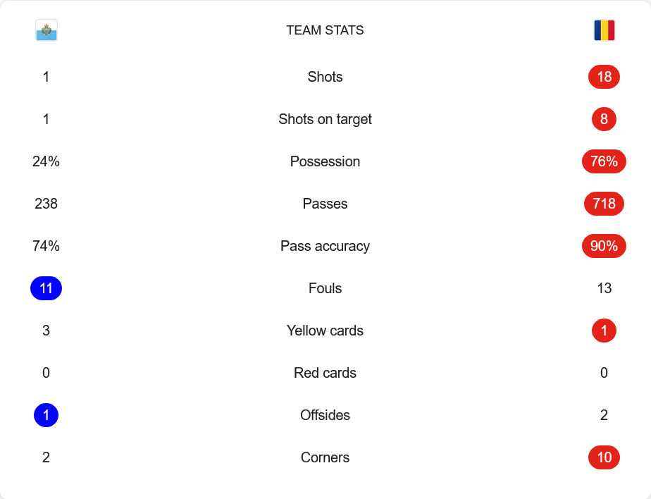 โรมาเนียเหนือกว่าชัดเจนทั้งการครองบอล การจ่ายบอล และโอกาสยิง โดยครองบอลมากถึง 67% เทียบกับซานมารีโนที่ได้เพียง 33% มีโอกาสยิงทั้งหมด 18 ครั้ง เข้ากรอบ 9 ครั้ง ขณะที่ซานมารีโนยิง 4 ครั้งเข้ากรอบเพียงหนเดียว ส่วนจังหวะผ่านบอล โรมาเนียจ่ายสำเร็จมากถึง 510 ครั้ง เทียบกับเจ้าบ้านที่ทำได้ราว 250 ครั้ง เกมนี้โรมาเนียได้เตะมุมถึง 6 ครั้งและยังไม่มีใบแดงหรือเหลืองเกิดขึ้น