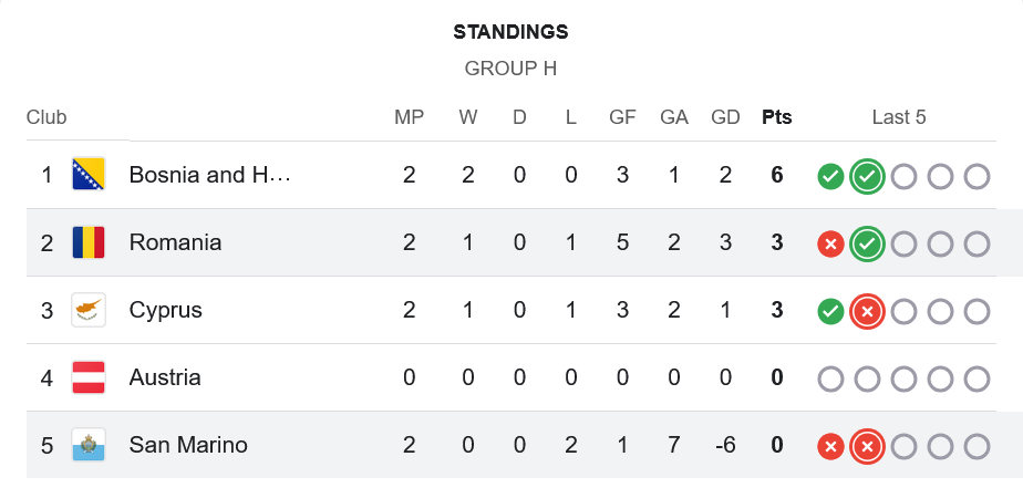 จากผลการแข่งขันนี้ โรมาเนีย เก็บเพิ่มเป็น 3 แต้มจาก 2 นัด ขยับขึ้นมาอยู่รองจ่าฝูงของกลุ่ม H มีแต้มเท่ากับไซปรัสแต่ลูกได้เสียดีกว่า ตามหลัง บอสเนียและเฮอร์เซโกวีนา ที่เก็บชัยสองนัดรวดอยู่ 3 แต้ม ส่วน ซานมารีโน ยังคงรั้งบ๊วยของกลุ่มจากการแพ้ 2 นัดรวด เสียไปถึง 7 ประตู ยิงได้เพียง 1 ลูก