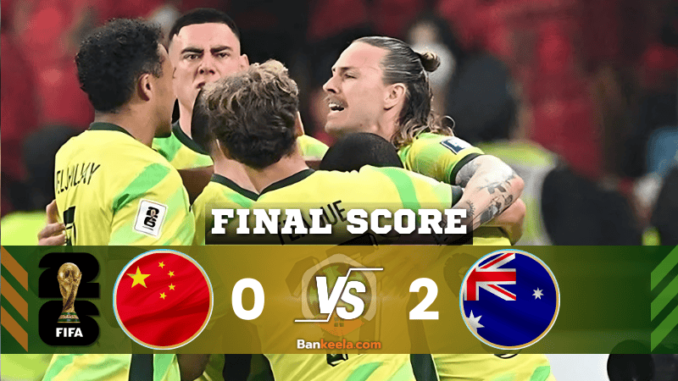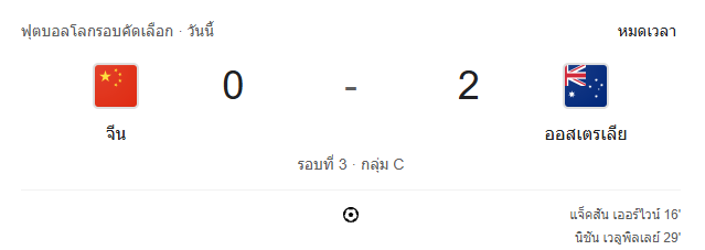 จีนเกือบได้เฮจากจังหวะจ่ายของเบห์รัม อับดูเวหลี ให้หวัง จื่อหมิง ซัดกลางกรอบแต่ติดบล็อกสุดท้าย - หมดเวลาการแข่งขัน: จีน 0-2 ออสเตรเลีย ทัพจิงโจ้เก็บสามแต้มสำคัญจากฟอร์มที่เฉียบขาดในครึ่งแรก ยิงสองเม็ดแล้วล็อกเกมเน้นความแน่นอน ขณะที่จีนแม้พยายามบุกหนักในครึ่งหลังแต่จังหวะสุดท้ายยังไม่คมพอ