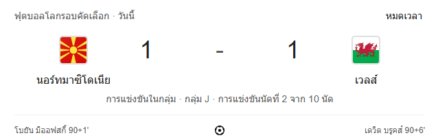 - หมดเวลาการแข่งขัน: มาซิโดเนียเหนือ 1-1 เวลส์ เกมนี้ไม่มีใครยอมใคร มาซิโดเนียเหมือนจะได้เฮในบ้านจากลูกยิงของมีอฟสกี้ แต่ความไม่ยอมแพ้ของเวลส์และความเยือกเย็นของบรูคส์ในนาทีสุดท้าย ทำให้แบ่งแต้มกันไปแบบสุดมัน!