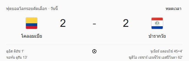 ผลบอลสดฟุตบอลโลก 2026 รอบคัดเลือก ระหว่าง ทีม โคลัมเบีย vs ปารากวัย วันนี้ 26/3/68 ดูบอลย้อนหลัง คลิปไฮไลท์ ดูบอลฟุตบอลโลก 2026 รอบคัดเลือก