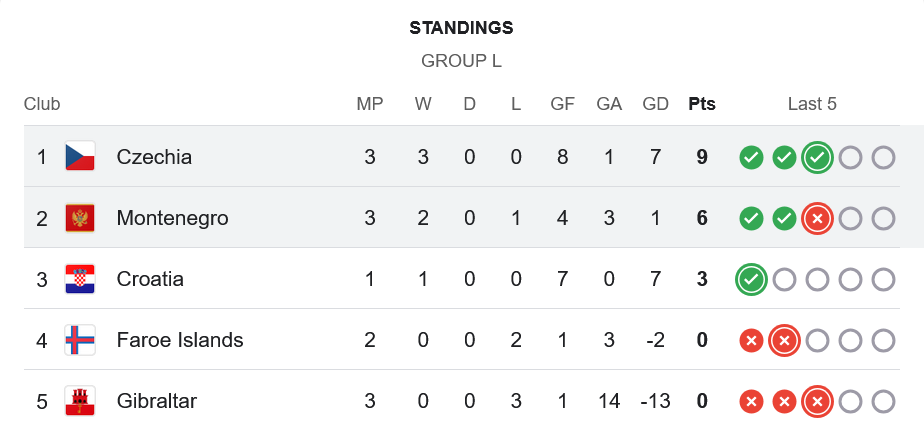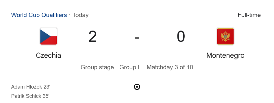 ชัยชนะนัดนี้ส่งให้ เช็กเกีย ยึดตำแหน่งจ่าฝูงกลุ่ม L อย่างเหนียวแน่น ด้วยการเก็บ 9 แต้มเต็มจาก 3 นัด ยิงไป 8 ประตู เสียแค่ลูกเดียว ส่วนมอนเตเนโกรแพ้เป็นนัดแรก แต่ยังคงอยู่อันดับ 2 ด้วย 6 แต้มจาก 3 นัด ยังมีลุ้นต่อในการแย่งโควต้าเข้ารอบ