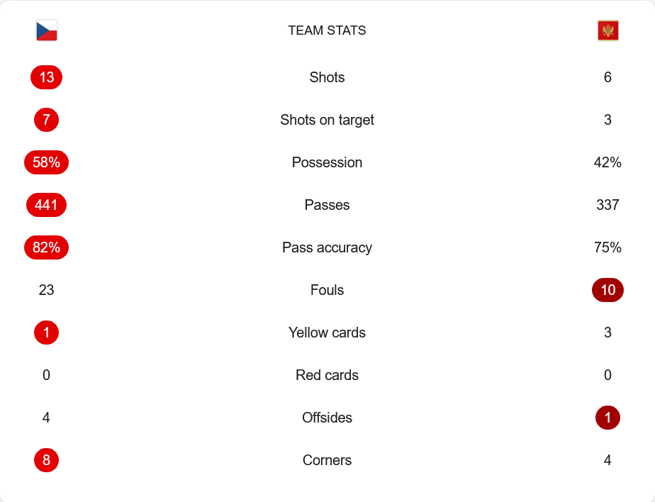 เกมนี้เช็กเกียเหนือกว่าทุกมิติ ครองบอลมากถึง 58% และจ่ายบอลมากถึง 441 ครั้ง โดยมีความแม่นยำ 82% ขณะที่มอนเตเนโกรครองบอลได้เพียง 42% จ่ายบอล 337 ครั้ง และแม่นยำแค่ 75% เช็กสร้างโอกาสยิงถึง 13 ครั้ง เข้ากรอบ 7 ครั้ง ส่วนทีมเยือนมีโอกาสยิงเพียง 6 ครั้ง เข้ากรอบ 3 โดยทีมเจ้าบ้านฟาวล์ถึง 23 ครั้ง ได้ใบเหลือง 1 ใบ ส่วนมอนเตเนโกรเสียฟาวล์ 10 ครั้ง แต่โดนใบเหลืองไปถึง 3 ใบ นอกจากนี้เช็กได้เตะมุมมากกว่าอีกด้วยที่ 8 ต่อ 4