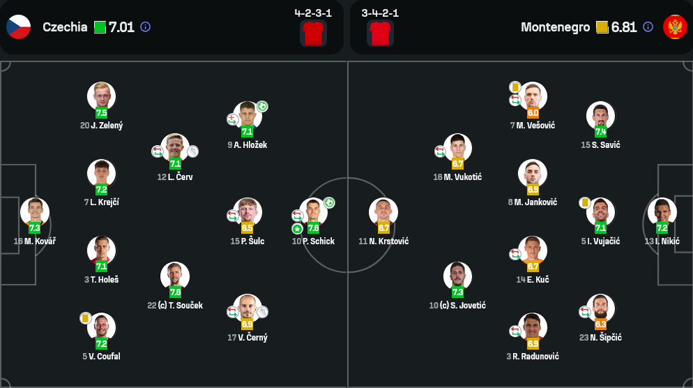 พาทริค ชิค หัวหอกทีมชาติเช็กแสดงให้เห็นถึงคลาสของดาวยิงตัวความหวัง เขายิงหนึ่งประตูจากโอกาสทอง และมีส่วนร่วมในหลายจังหวะอันตราย การเคลื่อนไหวของเขาสร้างปัญหาให้แนวรับมอนเตเนโกรตลอดทั้งเกม คว้าคะแนนสูงสุดของทีมที่ 7.6 และตำแหน่งผู้เล่นยอดเยี่ยมประจำแมตช์