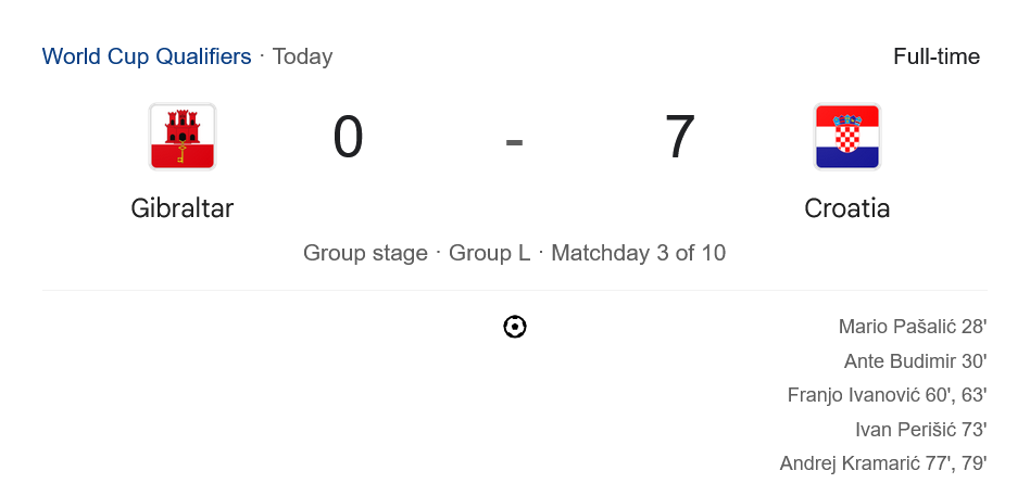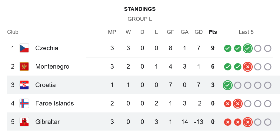 ชัยชนะของโครเอเชียในเกมนี้ทำให้พวกเขาเก็บ 3 แต้มแรกของรอบแบ่งกลุ่มได้สำเร็จ พร้อมกับผลต่างประตูได้เสีย +7 รั้งอันดับ 3 ของกลุ่ม L ตามหลังเช็ก (9 แต้ม) และมอนเตเนโกร (6 แต้ม) ขณะที่ยิบรอลต้าร์ยังจมบ๊วยของกลุ่ม ไร้แต้ม แถมเสียไปแล้วถึง 14 ประตูจาก 3 นัดแรก
