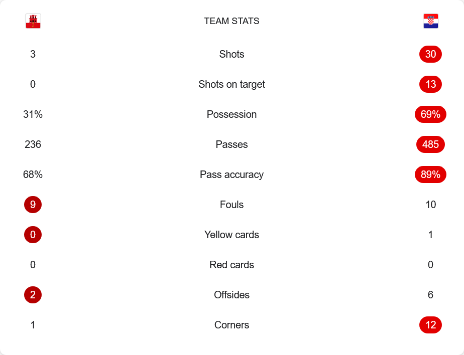 แม้โครเอเชียจะครองบอลเพียง 69% แต่การจบสกอร์กลับเหนือกว่ายิบรอลต้าร์แบบขาดลอย โดยมีโอกาสยิงถึง 30 ครั้ง และเข้ากรอบถึง 13 ครั้ง ขณะที่ยิบรอลต้าร์ไม่มีโอกาสยิงตรงกรอบเลยแม้แต่ครั้งเดียว โครเอเชียผ่านบอลทั้งหมด 485 ครั้งด้วยความแม่นยำ 89% ส่วนยิบรอลต้าร์ผ่านบอล 236 ครั้งด้วยความแม่นยำเพียง 68% เท่านั้น นอกจากนี้ โครเอเชียได้เตะมุมถึง 12 ครั้ง เทียบกับยิบรอลต้าร์ที่ได้เพียง 1 ครั้ง ถือเป็นเกมที่ชัดเจนว่าเกมรุกของทีมเยือนเหนือกว่าอย่างสิ้นเชิง