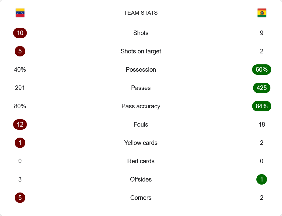 เวเนซุเอลาอาจครองบอลน้อยเพียง 40% แต่ความเด็ดขาดของพวกเขาชัดเจนกว่า ยิง 10 ครั้ง เข้ากรอบ 5 หน และได้ประตูถึง 2 ลูก ในขณะที่โบลิเวียครองบอล 60% จ่ายบอลมากถึง 425 ครั้งแม่นยำ 84% แต่ยิงเข้ากรอบเพียง 2 จากทั้งหมด 9 ครั้ง ซึ่งไม่เพียงพอจะเจาะแนวรับเจ้าถิ่นได้ ทั้งสองทีมเล่นหนักพอสมควรโดยเวเนซุเอลาฟาวล์ 12 ครั้ง ส่วนโบลิเวียมากถึง 18 ครั้ง ได้ใบเหลืองฝั่งละ 1 และ 2 ใบตามลำดับ แต่ไม่มีใบแดงในเกมนี้