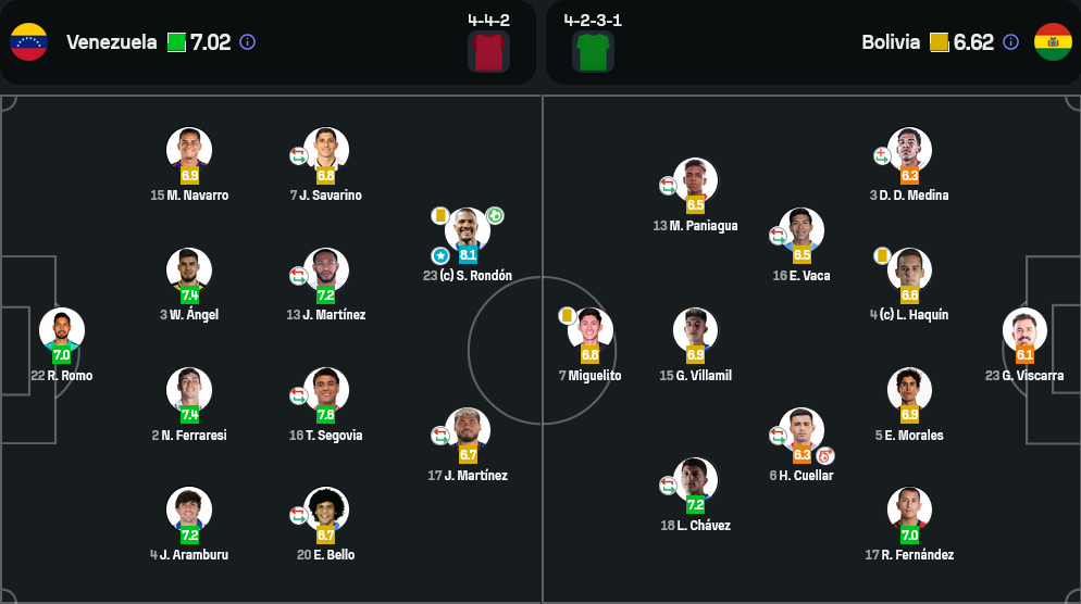 ฟอร์มระดับตำนานในเกมนี้ ซาโลมอน รอนดอน แสดงให้เห็นถึงความเก๋าเกมและความเป็นผู้นำที่แท้จริง เขาเป็นตัวขับเคลื่อนแนวรุกที่ชัดเจน สร้างสรรค์โอกาสและทำประตูสำคัญในนาทีที่ 30 พร้อมสร้างความปั่นป่วนให้แนวรับโบลิเวียอย่างต่อเนื่องจนจบเกม ได้คะแนนเรตติ้งสูงสุดในเกมนี้ถึง 8.1