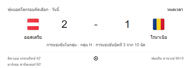 - หมดเวลาการแข่งขัน: ออสเตรีย 2-1 โรมาเนีย เจ้าบ้านคว้า 3 แต้ม