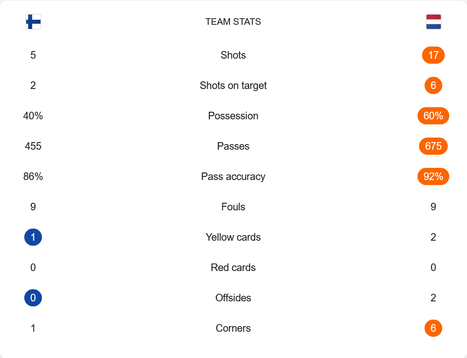 เนเธอร์แลนด์มีความเหนือกว่าในทุกสถิติ พวกเขายิงรวม 17 ครั้ง เข้ากรอบ 6 ครั้ง ขณะที่ฟินแลนด์ยิงเพียง 5 ครั้ง และเข้ากรอบ 2 ครั้ง การครองบอลตกเป็นของทีมเยือนถึง 60% เทียบกับฟินแลนด์ที่มีแค่ 40% จำนวนการผ่านบอลก็ทิ้งห่างกันลิบ โดยเนเธอร์แลนด์ผ่านบอลไป 675 ครั้ง สำเร็จถึง 92% ขณะที่ฟินแลนด์ผ่านบอล 455 ครั้ง ความแม่นยำอยู่ที่ 86% เตะมุมเป็นของเนเธอร์แลนด์ถึง 6 ครั้ง ฟินแลนด์ได้เพียง 1 ครั้ง ทั้งสองทีมทำฟาวล์เท่ากัน 9 ครั้ง โดยมีใบเหลืองฝั่งละ 1