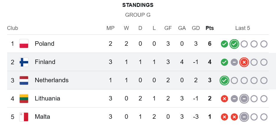 หลังเกมนี้ เนเธอร์แลนด์เก็บ 3 แต้มแรกในกลุ่ม G ได้สำเร็จจากการลงสนามเพียงนัดแรก ขยับขึ้นอันดับ 3 ทันที ส่วนฟินแลนด์มี 4 คะแนนจาก 3 นัด อยู่อันดับ 2 เป็นรองจ่าฝูง โปแลนด์ ที่ยังคงเก็บ 6 แต้มเต็ม และลิธัวเนียกับมอลตายังคงอยู่ท้ายตารางตามลำดับ