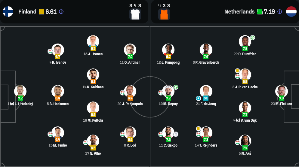 จากแผนการเล่นของเนเธอร์แลนด์ 4-3-3 ชัดเจนว่าพวกเขาเน้นการครองบอลและขึ้นเกมผ่านมิดฟิลด์ตัวกลาง เฟรงกี้ เดอ ยอง ทำหน้าที่คุมจังหวะเกมรุก-รับได้สมบูรณ์แบบ ขณะที่แนวริมเส้นอย่าง กัคโป และ ดัมฟรีส์ เติมเกมขึ้นสูงและมีส่วนร่วมกับประตูทั้งสองลูก ในแง่เกมรับ ฟาน ไดจ์ค ยังคงแข็งแกร่ง และการประสานกับ ฟาน เฮ็คเก ก็ช่วยป้องกันเกมโต้กลับของฟินแลนด์ได้หมดจด