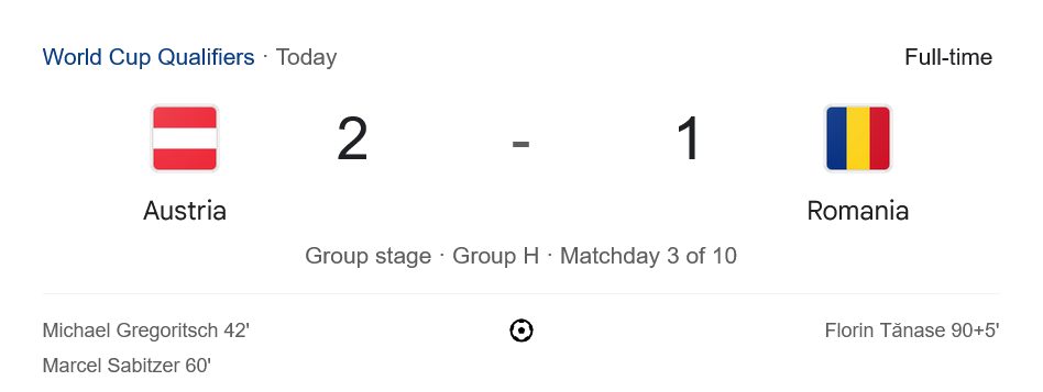 ตามข้อมูลจาก ตารางบอล นัดต่อไป ออสเตรียจะบุกไปเยือนซานมารีโนในวันที่ 11 มิถุนายน ซึ่งถือว่าเป็นโอกาสทองในการเก็บ 3 แต้มเพิ่ม ส่วนโรมาเนียจะได้กลับมาเล่นในบ้านพบกับไซปรัส ซึ่งถือเป็นเกมชี้ชะตาการแย่งอันดับรองจ่าฝูงของกลุ่มนี้โดยตรง