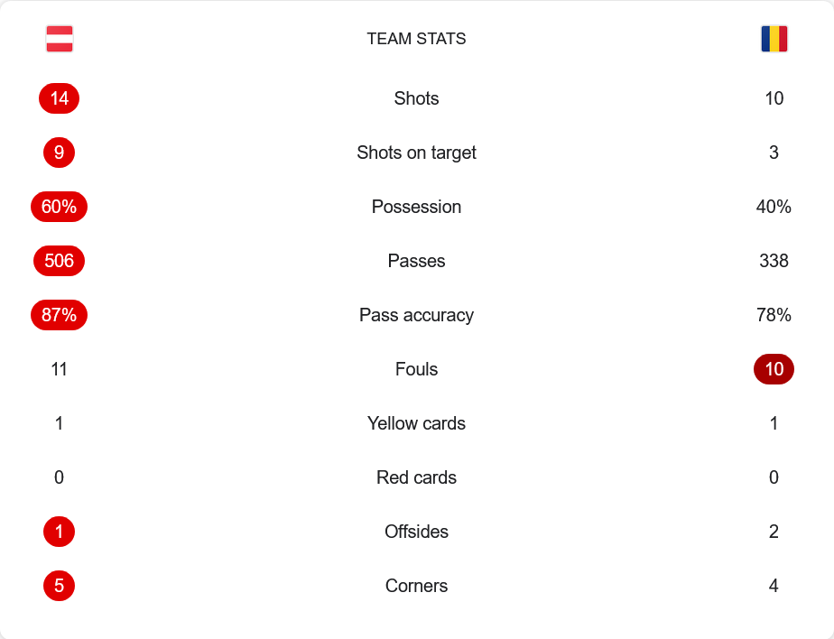 ออสเตรียครองบอลเหนือกว่าที่ 60% พร้อมกับจำนวนการผ่านบอลมากถึง 506 ครั้ง และมีความแม่นยำสูงถึง 87% เทียบกับโรมาเนียที่ผ่านบอลเพียง 338 ครั้ง แม่นยำแค่ 78% ด้านการยิง ออสเตรียมีโอกาสยิง 14 ครั้ง เข้ากรอบ 9 ส่วนโรมาเนียมี 10 ครั้ง เข้ากรอบ 3 ใกล้เคียงกันแต่ประสิทธิภาพแตกต่าง ฟาวล์ของทั้งสองทีมสูสีกัน 11 ต่อ 10 ครั้ง มีใบเหลืองทีมละใบ ลูกเตะมุมออสเตรียทำได้ 5 ครั้ง ส่วนโรมาเนีย 4 ครั้ง และไม่มีใบแดงตลอดเกม