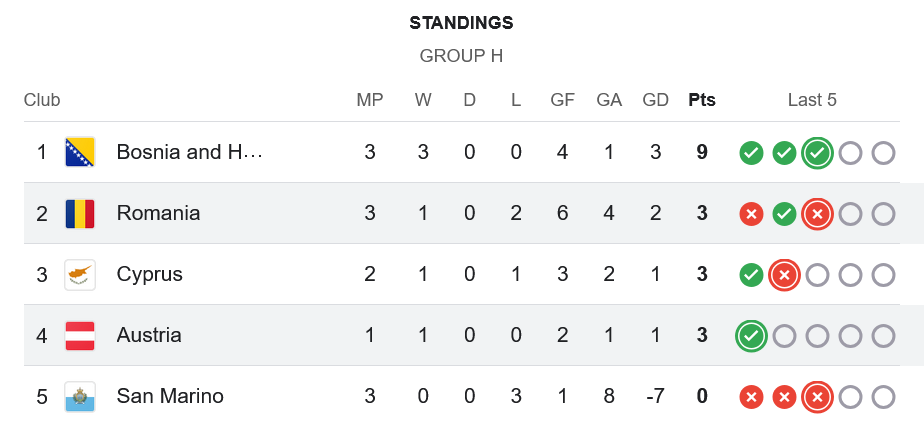 หลังเกมนี้ ออสเตรียเก็บ 3 แต้มแรกจากนัดแรกของพวกเขาในรอบแบ่งกลุ่ม ขยับขึ้นมามีคะแนนเท่ากับ โรมาเนีย และไซปรัส ที่มีอยู่คนละ 3 แต้ม ทำให้สถานการณ์ในกลุ่ม H ตึงเครียดขึ้นมาทันที โดยมีบอสเนียฯ ยังนำเดี่ยวด้วย 9 แต้มเต็ม ขณะที่ซานมารีโนยังไร้แต้มและเป็นบ๊วยของกลุ่ม
