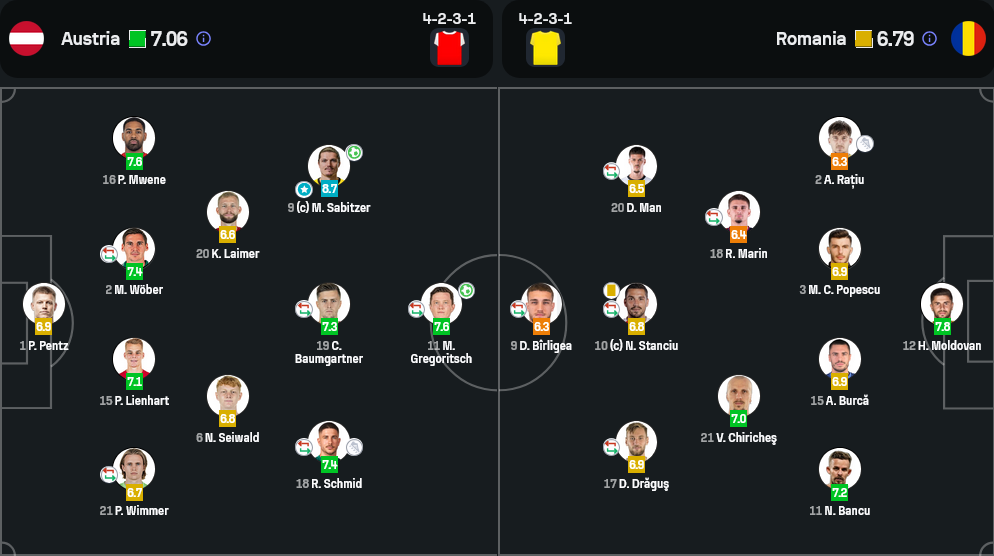 มาร์เซล ซาบิตเซอร์ มิดฟิลด์จากดอร์ทมุนด์โชว์คลาสเต็มสูบในเกมนี้ ด้วยเรตติ้ง 8.7 เขาทำได้ทั้ง 1 ประตู 1 แอสซิสต์ เป็นแกนหลักในแดนกลางของออสเตรียอย่างแท้จริง ไม่ว่าจะเป็นการเชื่อมเกม จ่ายบอล หรือจบสกอร์ ซาบิตเซอร์คือหัวใจของชัยชนะในนัดนี้อย่างแท้จริง